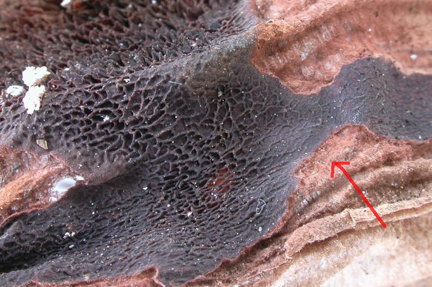 Alte Fruchtkörper sollten mikroskopiert werden, da sie dem Echtem Hausschwamm (siehe unten) sehr ähnlich sein können. In der Regel finden sich noch einige Sporen. Die Differenzierung fällt leicht, wenn Sklerotien oder die haarartigen Stränge gefunden werden. Auch ein rötlicher Rand könnte ein Hinweis auf eine Leucogyrophana-Art sein (siehe Pfeil). - zurück