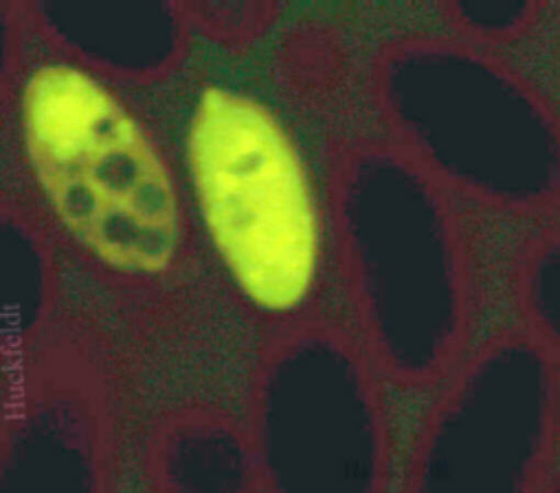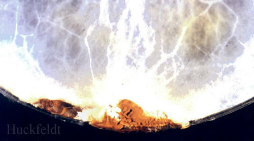 Ein anderes Bild ergab sich bei Mycelien, die Conidien (Mitosporen) bilden, wie bei C. puteana und G. trabeum. Bei ihnen war nach sieben bis neun Wochen das gesamte Mycel abgestorben, bzw. die Stoffwechselaktivität war zum Erliegen gekommen. Das Mycel war eingefallen, und die Hyphen wiesen keine Plasmaströmungen mehr auf. Die reichlich gebildeten Conidien aber waren hoch vital. Sie fluoreszierten stark, was auf Stoffwechselaktivität hindeutete (s. Abb. 29 (Bild, 3,33 KB)).