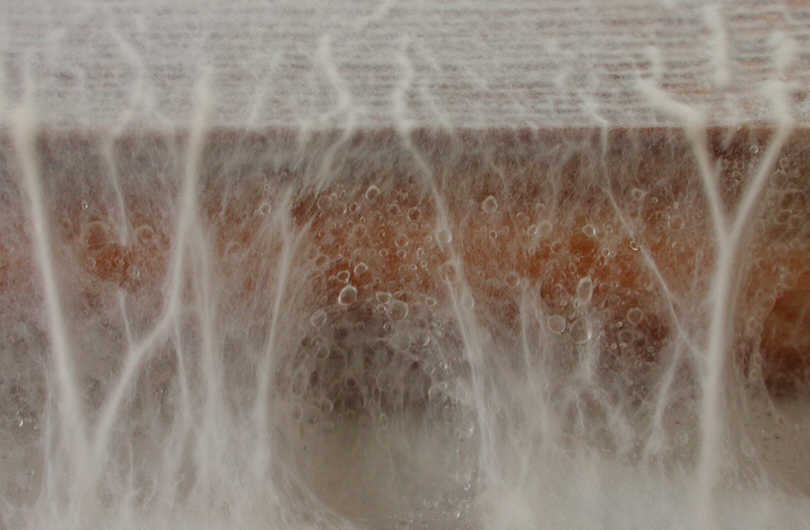 Junge, wachsende Stränge der Weißen Porenschwämme sind rein weiß und zeigen häufig kleine, durchsichtige Guttationstropfen. Im Gegensatz zu alten Strängen kann noch ein ausgeprägtes Zwischenmycel vorhanden sein. Die Stränge können von denen des Hausschwammes (Serpula lacrymans) dadurch unterschieden werden, dass die der Porenschwämme auch trocken biegsam sind. - zurück