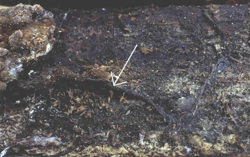 Typischer sehr alter, oft nicht einfach zu entdeckender Strang eines Braunen Kellerschwammes. Diese Stränge dienen der vegetativen Vermehrung des Pilzes (Schwammes) und somit der Ausbreitung des Befalls. Meist wachsen sie im verborgenem (Bild, 42 KB). - zurück