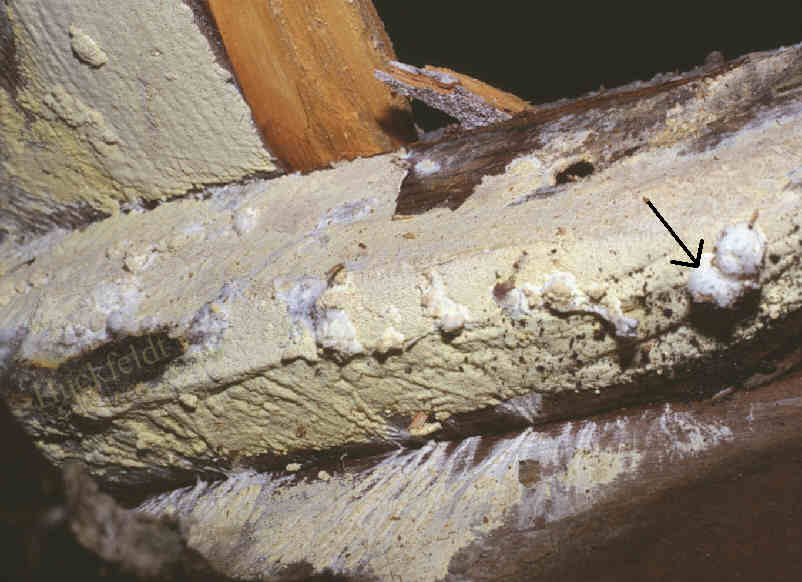 Typische gelbe, porige Fruchtkörper (Detailbild, 47 KB), die hier in einer durchfeuchteten Decke entstanden. Diese wachsen noch und haben daher eine hell zitronengelbe Farbe. Bei hoher Luftfeuchtigkeit wird ein weißes Luftmycel gebildet (Pfeil). - weiter (Bild, 47 KB) oder zurück