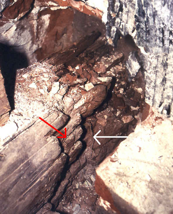 , nagelmürben Eichenholzes (roter Pfeil) und Reste des Mycels (weißer Pfeil). Werden Balkenköpfe in dieser Weise eingemauert, kann kondensierende Feuchtigkeit nur sehr schwer wieder abziehen. Noch schlimmer ist es, wenn die Balkenköpfe mit Dachpappe oder dergleichen umhüllt werden. Wenn dann Wasser eindringt, kann dieses nicht wieder aus dem Holz entweichen - ein Schaden ist vorprogrammiert (Bild, 59 KB). Besser ist es, zwischen Balkenkopf und Mauerwerk links, rechts und hinten einen Luftspalt zu lassen. Derartige Spalten ermöglichen die nötige Luftzirkulation. - zurück