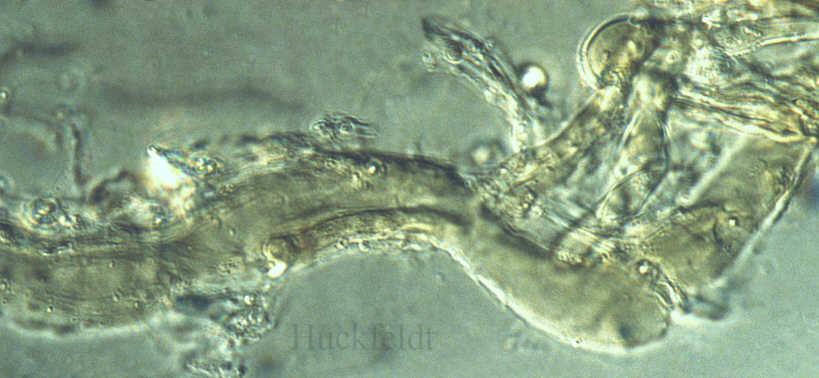 In dem mikroskopisches Bild (Phasenkontrast) der Grund- und Gefäßhyphen sind die Verzweigungen der großen Gefäßhyphe gut zuerkennen. Die Gefäßhyphen sind dicht von Grundhyphen umgeben. Ihr Durchmesser beträgt zwischen 8?-26 µm. Die untere Zeichnung zeigt Gefäßhyphen von der Kleinen oder Balkenbewohnenden Fältlingshaut (Leucogyrophana pulverulenta - aus