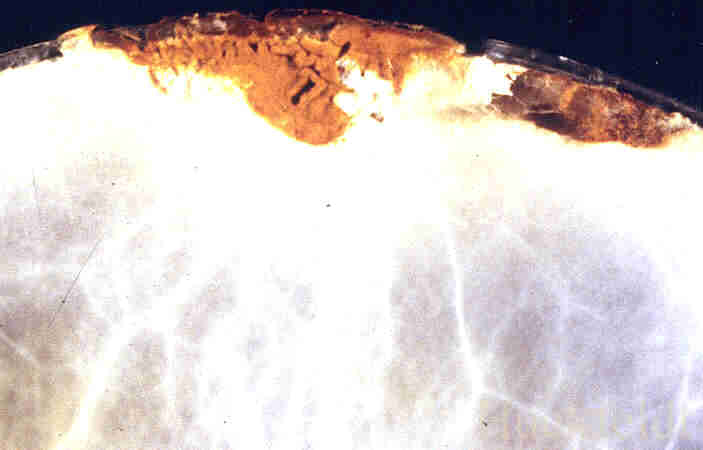 Gut zu sehen sind in dieser Kulturschale des Hausschwammes die Fruchtkörper. Die merulioiden Falten des Hymeniums sind allerdings nur schwach ausgeprägt. Im unteren Teil des Bildes sind die Ansätze von Strängen zu sehen. - zurück