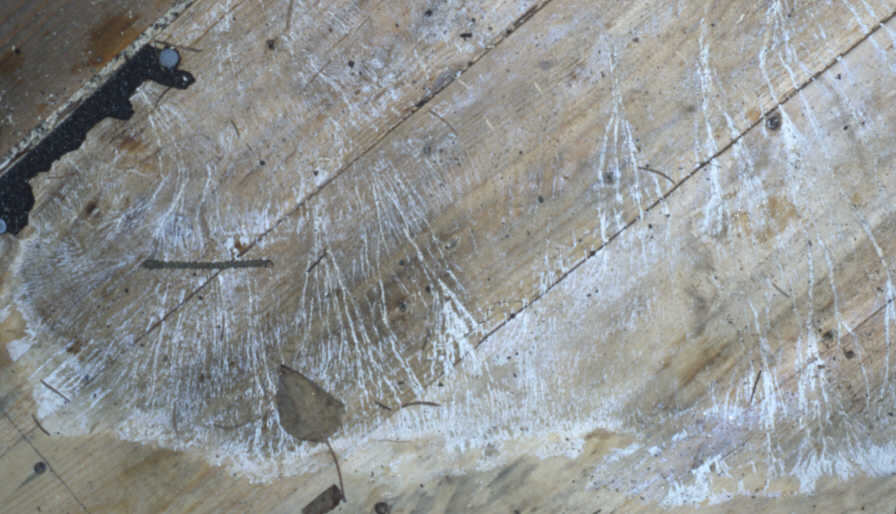 Zu sehen ist ein Strangmycel, das zwischen Deckpappe und Dachbeplankung wuchs. Strangmycelien sollten nicht Oberflächenmycelien gleichgesetzt werden, da beide Mycelien sich gut gegeneinander abgrenzen lassen. Das Strangmycel ist weiß und wächst strahlenförmig, zum Teil auch eisblumenartig. Die Stränge bleiben auch trocken biegsam und nur die Zuwachszone ist flächendeckend, dahinter jedoch offen. Wachsende Mycelien und insbesondere das frisch abgebaute Holz haben einen eigentümlich herben Geruch. Das Mycel ist leicht mit dem des Grauenden Porlings (Diplomitoporus lindbladii) zu verwechseln, dem aber der herbe Geruch fehlt. - zurück