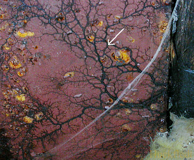 Junge Stränge des Kellerschwammes sind cremefarben und haben ein typisches, wurzelartiges Verzweigungsmuster. Diese Stränge wuchsen unter Laborbedingungen auf Kiefernholz. Zum Vergleich sind unten ältere Stränge aus einem Gebäude gezeigt. - zurück