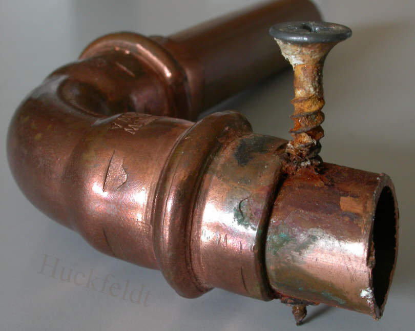 Heizungsrohre wie das oben gezeigte könnten bei fehlerfreier Installation lange halten, jedoch werden kleine Fehler durch moderne Werkzeuge (Akkuschrauber) nicht immer gleich bemerkt. Die enge Verbindung zweier unterschiedlich "edler" Metalle lässt eine "Batterie" entstehen (VOLTA 1800). Der Elektronenfluss führt zu einer sehr schnellen Korrosion der Schraube. Aus dem größer werdenden Leck kann so immer mehr Wasser austreten. Die entstehenden Kosten sind dann nicht unerheblich. - zurück