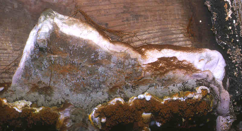 Abgestorbene Fruchtkörper können als Nährstoff für Schimmelpilze dienen. Der abgebildete Fruchtkörper des Hausschwammes wurde von Schimmelpilzen besiedelt. Aus dem Fruchtkörper wachsen feine, schwarze Konidienträger, an denen sich grüne bis blau-schwarze Konidien bilden. Die braunen Flecken auf den verschimmelten Teilen des Fruchtkörpers sind Sporen des Hausschwammes. Sie bilden häufig dicke Schichten. - zurück
