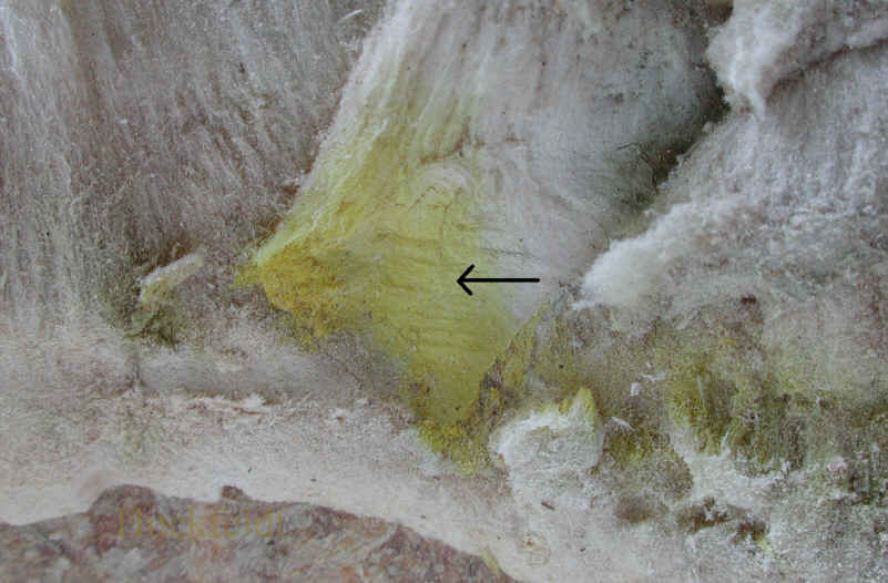 Das sehr feine, häufig gelbfleckige (Pfeil) Luftmycel lässt sich leicht von der Oberfläche abziehen. Diese Farbe wird häufig als "Hemmfarbe" bezeichnet, was ein vermindertes oder gestopptes Wachstum suggeriert, obwohl die gelben Hyphenteile zum Teil kräftig wachsen können. - zurück