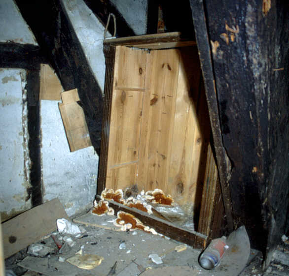 Typische zimtbraune merulioide Fruchtkörper mit weißem scharf begrenztem Zuwachsrand wuchsen hier in einem Schrank (Bild, 46 KB). Dabei sollte bedacht werden, dass der Schwamm hier weniger diesen Schrank angreift als vielmehr das in Mauern und Boden enthaltene Holz dieser Fachwerkkonstruktion. Die Fruchtkörper sind ein sicheres Zeichen, dass ein Holzabbau stattgefunden hat, und der Schrank bietet in seiner Bodenplatte nicht genug Nahrung, die für die Entwicklung dieser Fruchtkörper reichen würde. Die Stabilität des Gebäudes ist zu prüfen. - zurück